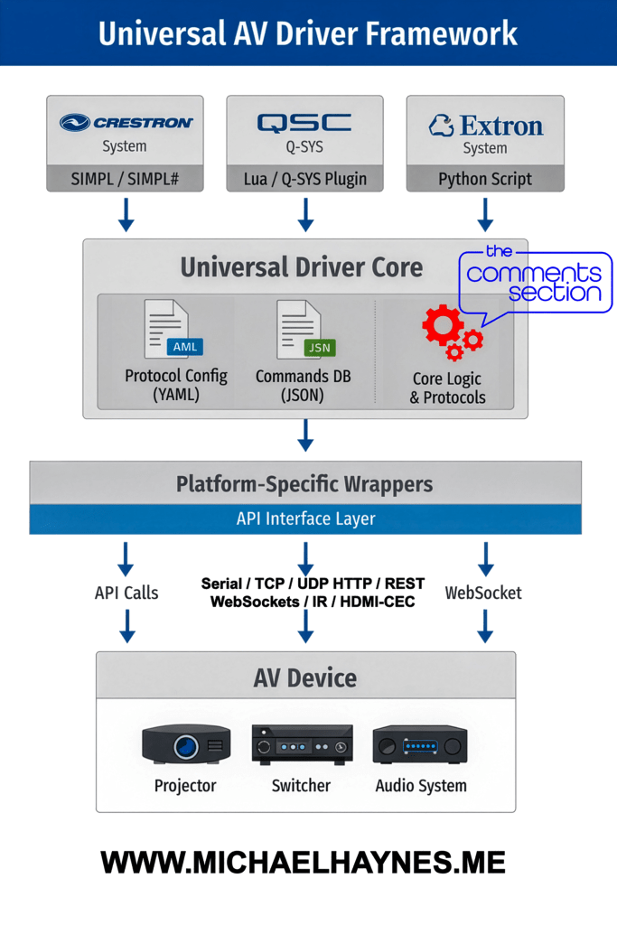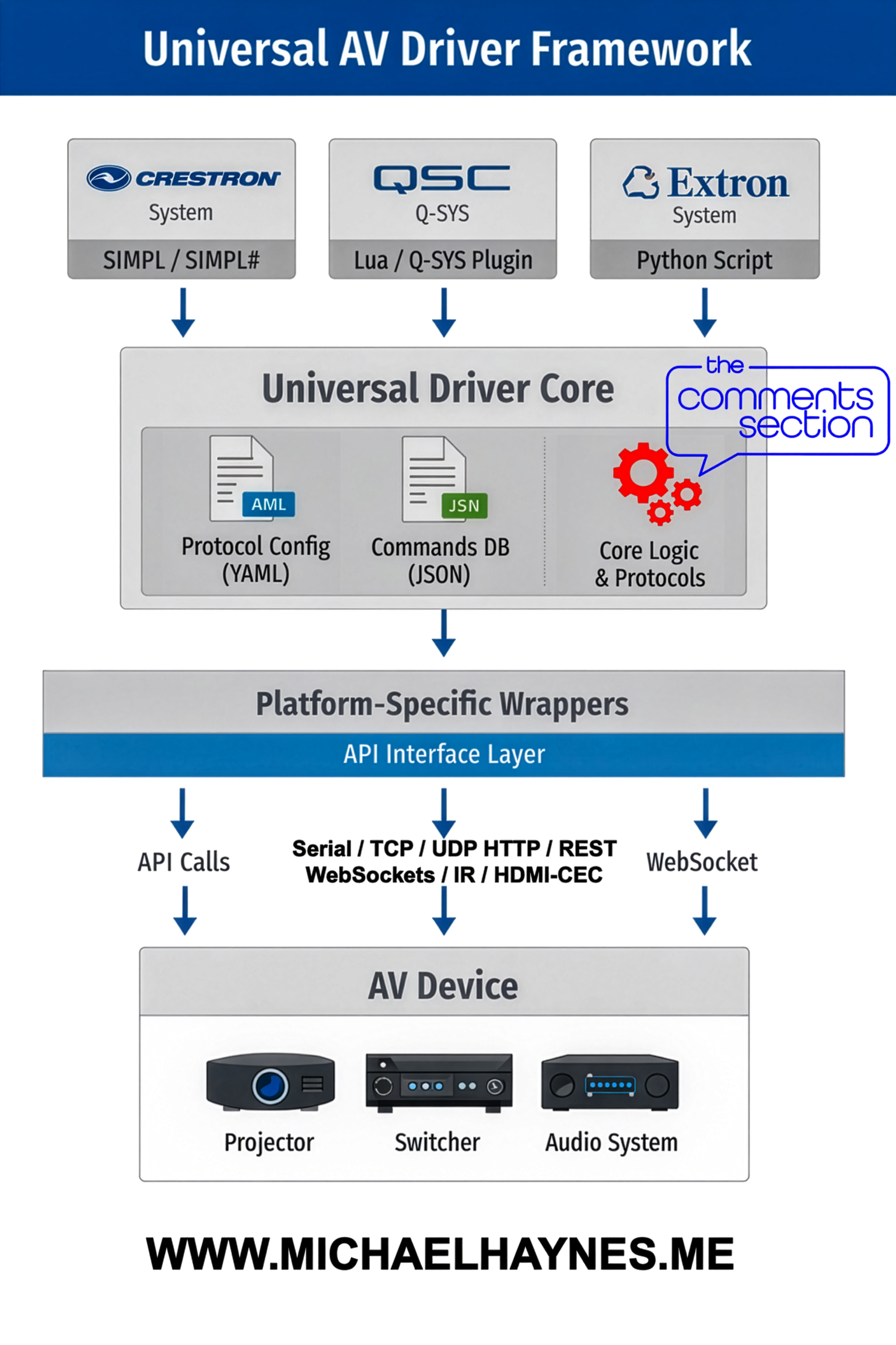 Your code should always pull from a config file (JSON or YAML). Keep the logic clean, flexible, and future-proof. YAML is a more human-friendly universal language that doesnโt require brackets. JSON is more strict and machine-friendly. Lua (Qsys), Python, and C# support deserialization of YAML and JSON.